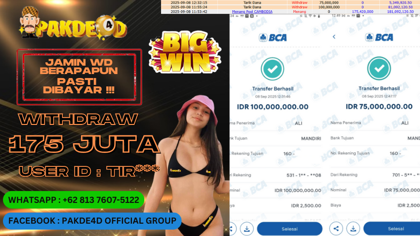 Selamat Kepada Member Setia PAKDE4D dengan USER ID : TIR*** di PERMAINAN CAMBODIA POOLS sebesar Rp. 175.000.000,- LUNAS langsung mendarat ke rekening tanpa bertele – tele. Terimakasih telah mempercayakan PAKDE4D sebagai Situs Bandar Terpercaya dan Terjamin Aman! Tunggu apalagi? Daftar sekarang juga bersama PAKDE4D dan dapatkan berbagai promo menarik setiap harinya.
