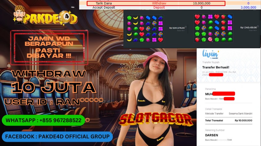 Selamat Kepada Member Setia PAKDE4D dengan USER ID : RAN***** di PERMAINAN SLOT sebesar Rp. 10.000.000,- LUNAS langsung mendarat ke rekening tanpa bertele – tele. Terimakasih telah mempercayakan PAKDE4D sebagai Situs Bandar Terpercaya dan Terjamin Aman! Tunggu apalagi? Daftar sekarang juga bersama PAKDE4D dan dapatkan berbagai promo menarik setiap harinya.