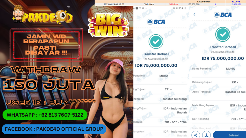 Selamat Kepada Member Setia PAKDE4D dengan USER ID : BUY******* di PERMAINAN SLOT sebesar Rp. 150.000.000,- LUNAS langsung mendarat ke rekening tanpa bertele – tele. Terimakasih telah mempercayakan PAKDE4D sebagai Situs Bandar Terpercaya dan Terjamin Aman! Tunggu apalagi? Daftar sekarang juga bersama PAKDE4D dan dapatkan berbagai promo menarik setiap harinya.
