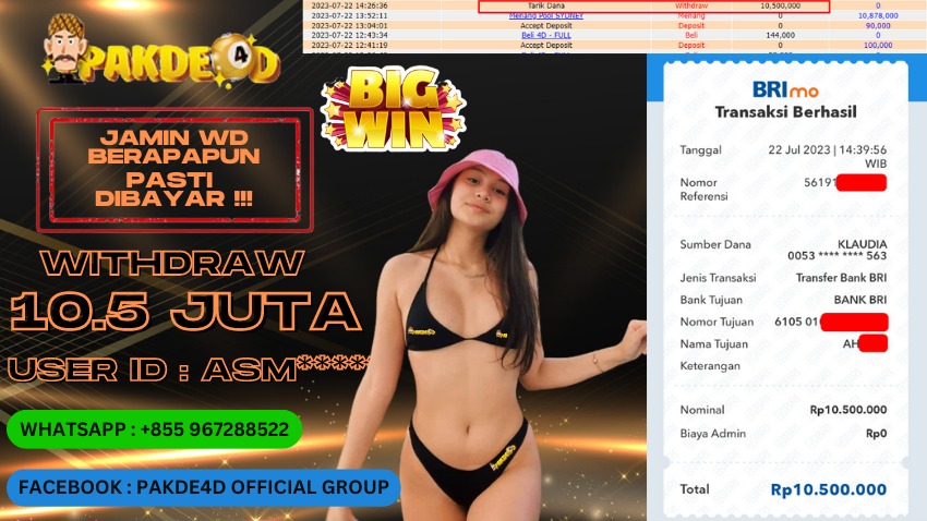 Selamat Kepada Member Setia PAKDE4D dengan USER ID : ASM***** di PERMAINAN TOGEL PASARAN SYDNEY sebesar Rp. 10.500.000,- LUNAS langsung mendarat ke rekening tanpa bertele – tele. Terimakasih telah mempercayakan PAKDE4D sebagai Situs Bandar Terpercaya dan Terjamin Aman! Tunggu apalagi? Daftar sekarang juga bersama PAKDE4D dan dapatkan berbagai promo menarik setiap harinya.