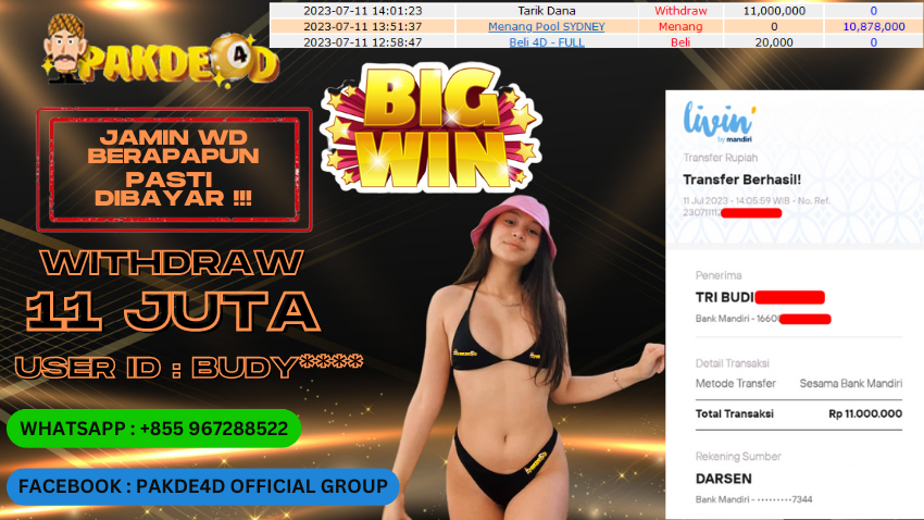 Selamat Kepada Member Setia PAKDE4D dengan USER ID : BUDY***** di PERMAINAN TOGEL PASARAN SYDNEY sebesar Rp. 11.000.000,- LUNAS langsung mendarat ke rekening tanpa bertele – tele. Terimakasih telah mempercayakan PAKDE4D sebagai Situs Bandar Terpercaya dan Terjamin Aman! Tunggu apalagi? Daftar sekarang juga bersama PAKDE4D dan dapatkan berbagai promo menarik setiap harinya.